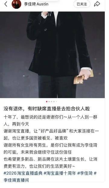 4月8日晚,李佳琦哽咽宣布将短暂退出直播,此事引发热议。深夜,李佳琦发文回应:没有退休,缺席是去拍合伙人、做新尝试。直播十年,从一人到一群人,感恩粉丝信任,未来将继续助力国货,让消费更有活力。